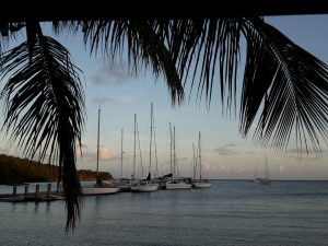 Pour vous réchauffer le cœur, je vous envoie ma dernière photo tropicale, prise du bar du chantier où nous avons laissé notre bateau pour l’été et revenir en France.